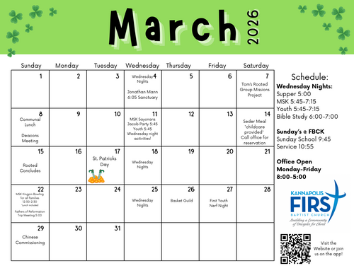 This will be a guide through the Passover ceremony and will be led by Sam Nadler of Word of Messiah Ministries. This event is open to all ages 12+. Childcare is available. The cost is $5.00. Call the church office to sign up. Deadline for registration is Monday, March 2nd.