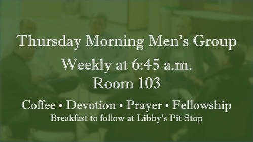 Overview: Pastor Tom Cabaniss leads this men's group weekly on Thursday mornings. The Bible Code by O.S. Hawkins is about finding Jesus in every book in the Bible. Jesus challenged His followers to "search the Scriptures... for they testify of Me" (John 5:39). As this group will study together, Jesus can be found Genesis-Revelation, and in finding Him, life is found. Eternal life and in the here and now. The men at this group gather around tables with coffee for about 20 minutes, enjoying a devotion and discussion. This is followed by a time of intercessory prayer. The group then adjourns for breakfast together. New men are always welcome.